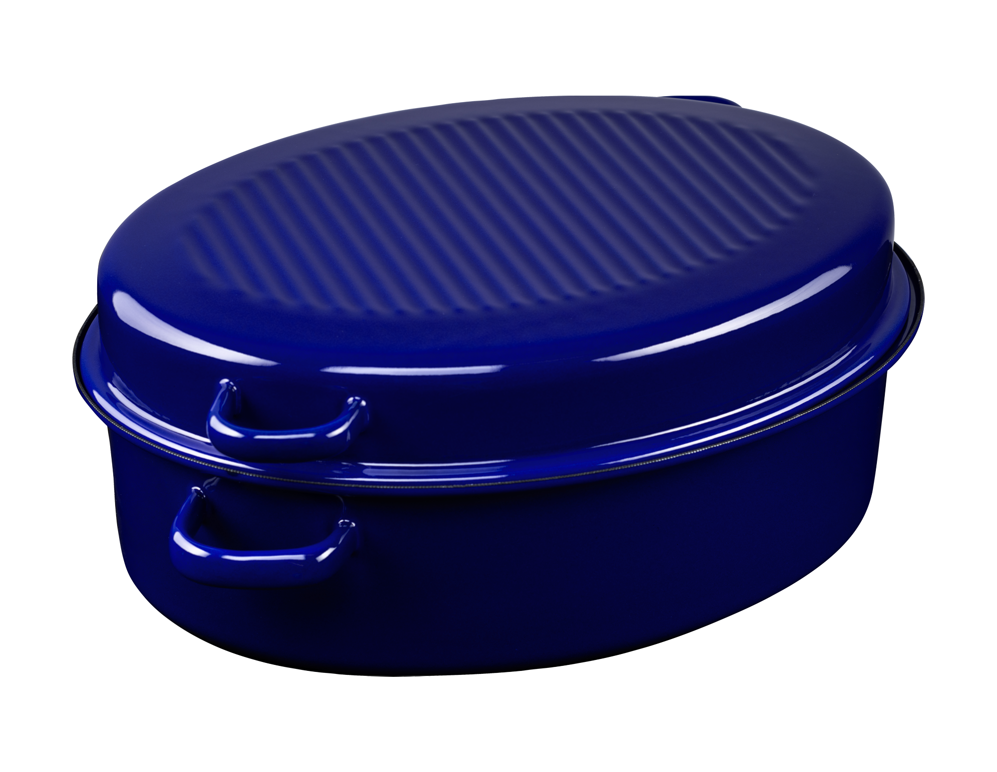 Der ovale Emaille-Bräter mit Tragegriffen und Deckel ist perfekt geeignet, um Fleisch stundenlang zu schmoren. Der passgnau schließende Deckel sorgt dank des Falzes im unteren Bräterteil dafür, dass die Aromen bewahrt und die Flüssigkeit nicht entweicht. Beim Abnehmen des Deckels wird die Verwendung von Topflappen empfohlen. Neben Gänsebraten können auch andere Braten und Schmorgerichte im Backofen perfekt zubereitet werden. Der Deckel kann zudem als zusätzliche Back- und Bratform verwendet werden, wenn er einmal nicht zum Schmoren benötigt wird. Nach dem Kochen lässt sich der Braten direkt in der Form schneiden und der Bräter ist einfach zu reinigen.