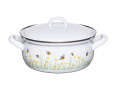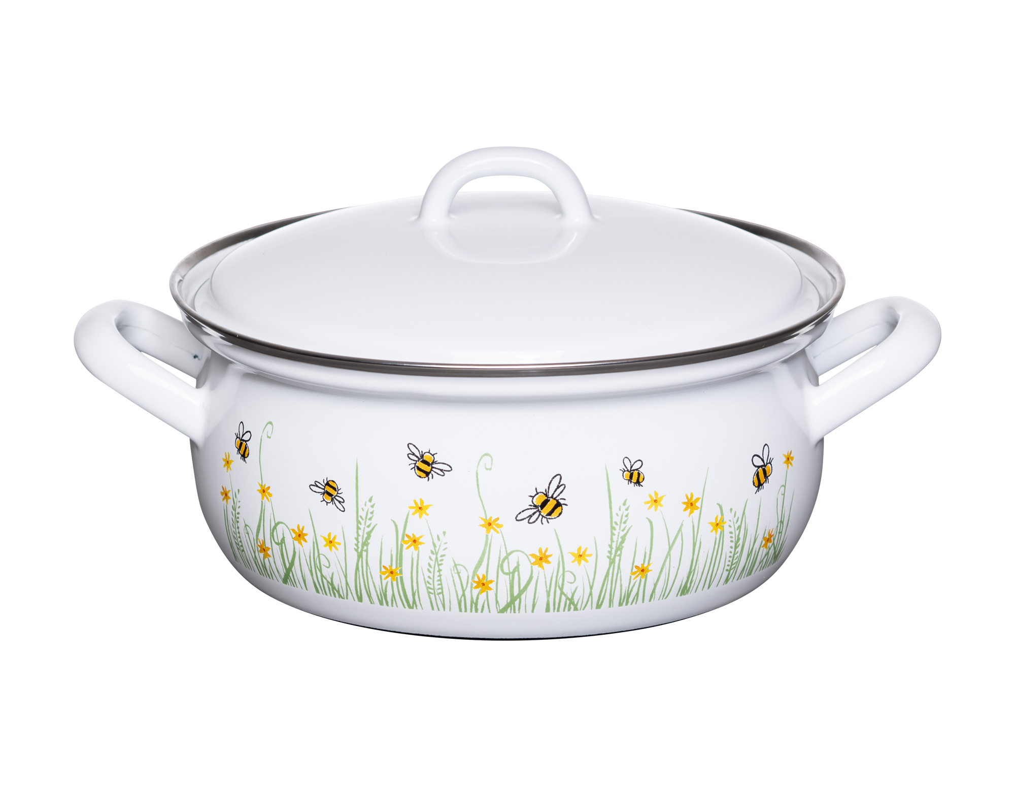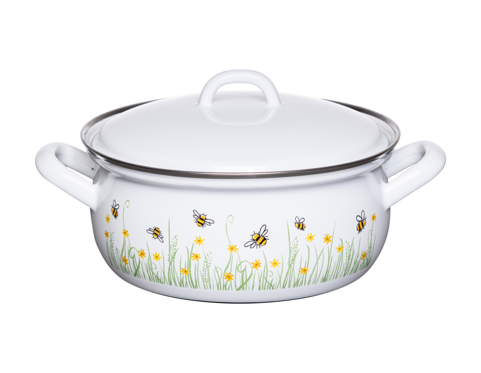 Unsere Kasserollen mit Deckel in dieser Version haben eine bauchige Form und klassische Emaillegriffe. Der Deckel liegt gut auf der Kasserolle und fungiert als Energiewächter: Sobald er zu klappern beginnt, ist es Zeit, die Hitze zu reduzieren, um Strom zu sparen. Je nach Herd kann etwa 5 Minuten vor Garende vollständig abgeschaltet werden, da Emaille die Hitze lange speichert. Daher empfehlen wir dringend, Topflappen zum Heben der Töpfe und Deckel zu verwenden, da auch die Emaillegriffe die Wärme speichern. Ein Vorteil der Emaillegriffe ist, dass der Topf problemlos zum Warmhalten in das Backrohr geschoben werden kann. Der Rand der Kasserolle ist mit einem robusten Chromrand versehen.