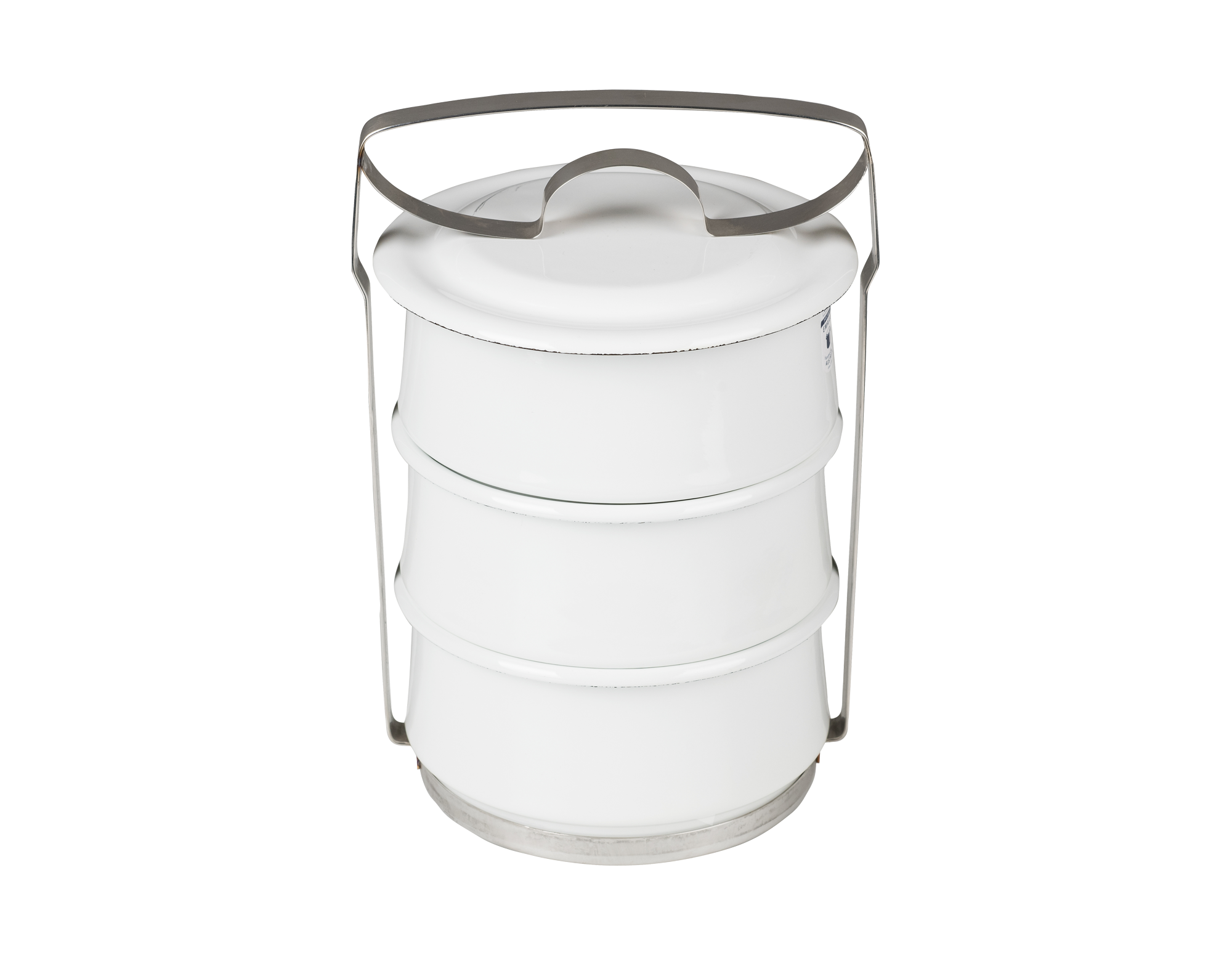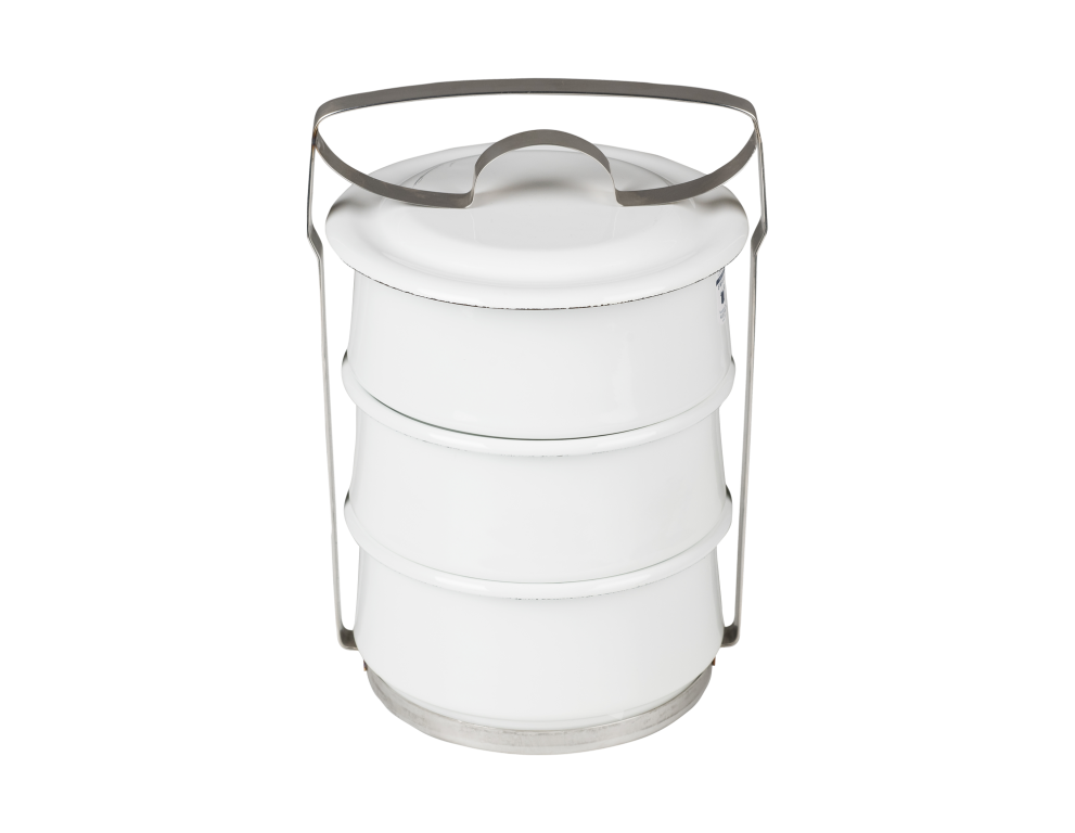Unser Essensträger oder Henkelmann hilft Ihnen, Plastik zu vermeiden. Mit den stapelbaren Emaillebehältern können Sie das Essen von Ihrem Lieblingsrestaurant bequem nach Hause bringen und Ihre Lieblingsspeisen sicher und einfach überallhin transportieren. Ob ins Büro, zum Picknick oder zum Abendessen mit Freunden – die Speisen werden in die Aufbewahrungsdose gefüllt, mit der Eisenspange fest verschlossen und mit dem Griff mühelos transportiert. Emaille ist hervorragend für die Lagerung von Speisen geeignet. Die porenlose Oberfläche ist resistent gegenüber Fruchtsäuren und ist bakterien- und schmutzabweisend. Lebensmittel können hygienisch verwahrt werden und behalten ihren natürlichen Geschmack. Der Essensträger oder Henkelmann ist im klassischen Weiß erhältlich und kann mit zwei, drei oder vier Elementen erworben werden. Die Behälter haben einen Durchmesser von 14 cm.