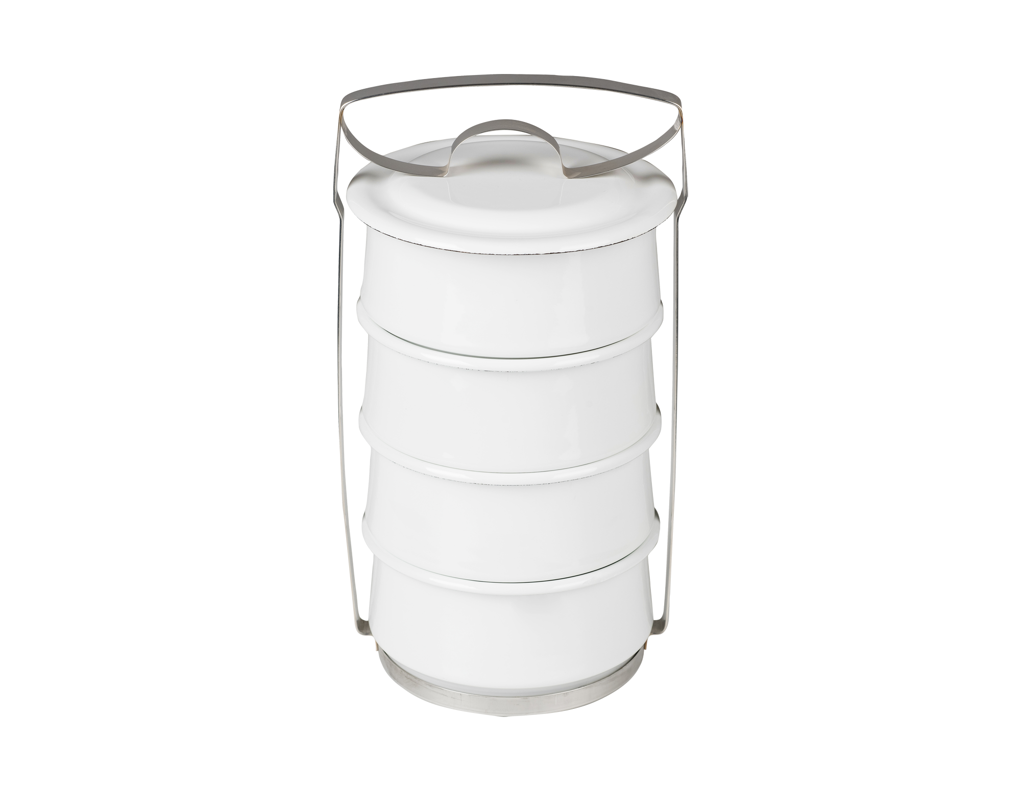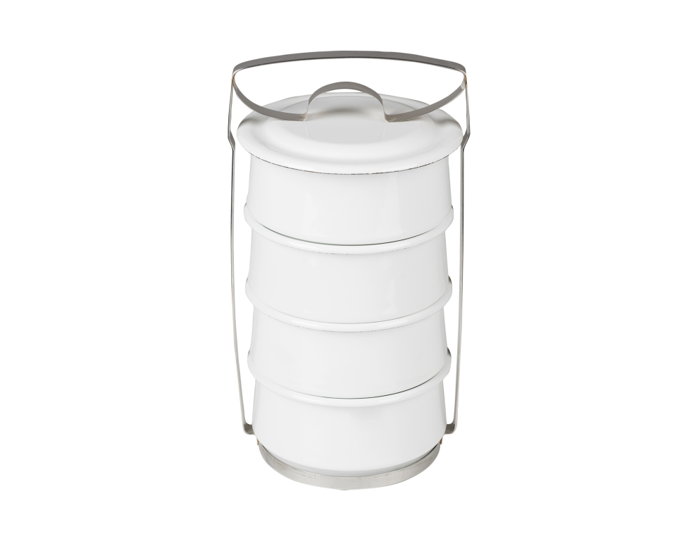 Unser Essensträger oder Henkelmann hilft Ihnen, Plastik zu vermeiden. Mit den stapelbaren Emaillebehältern können Sie das Essen von Ihrem Lieblingsrestaurant bequem nach Hause bringen und Ihre Lieblingsspeisen sicher und einfach überallhin transportieren. Ob ins Büro, zum Picknick oder zum Abendessen mit Freunden – die Speisen werden in die Aufbewahrungsdose gefüllt, mit der Eisenspange fest verschlossen und mit dem Griff mühelos transportiert. Emaille ist hervorragend für die Lagerung von Speisen geeignet. Die porenlose Oberfläche ist resistent gegenüber Fruchtsäuren und ist bakterien- und schmutzabweisend. Lebensmittel können hygienisch verwahrt werden und behalten ihren natürlichen Geschmack. Der Essensträger oder Henkelmann ist im klassischen Weiß erhältlich und kann mit zwei, drei oder vier Elementen erworben werden. Die Behälter haben einen Durchmesser von 14 cm.
