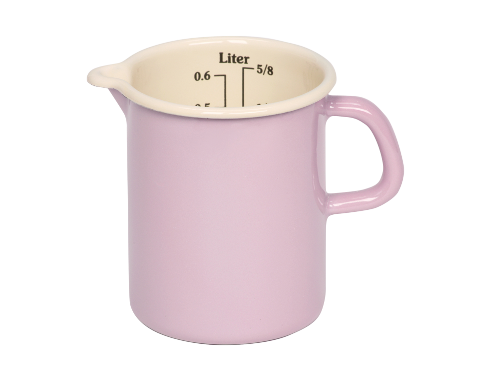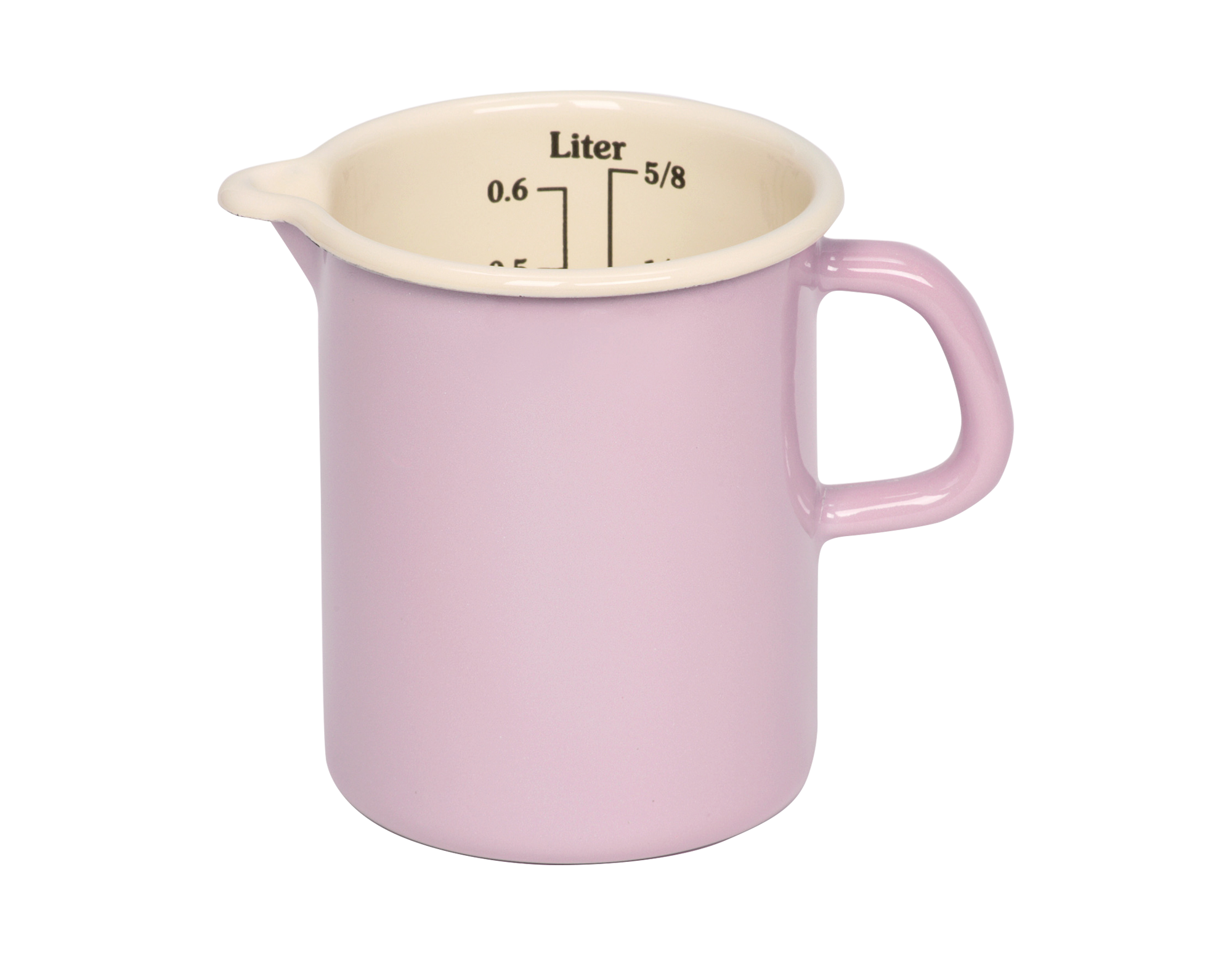 Das Küchenmaß oder der Messbecher ist ein unverzichtbares Werkzeug zum Portionieren von Koch- und Backzutaten wie Mehl, Zucker, Milch, Wasser sowie anderen kalten oder heißen Flüssigkeiten. Im Inneren des Messbechers befinden sich zwei Skalen, die einmal Liter in Zentilitern und je nach Größe des Messbechers auch in 1/4 oder 1/8 Liter anzeigen – dies entspricht der traditionellen österreichischen Maßeinheit für Flüssigkeiten. Der Messbecher ist mit einem bequemen seitlichen Griff und einem Ausguss, genannt Schnabel, ausgestattet, der das Ausgießen von Flüssigkeiten erleichtert. Der Emaille-Messbecher eignet sich auch hervorragend zum Erwärmen von genau abgemessenen Flüssigkeiten wie Milch oder Wasser für den Hefeteig oder Suppe für Risotto. Es sollte jedoch mit kleiner Flamme gekocht werden, da der Durchmesser des Bodens sehr klein ist. Beim Erwärmen von Milch empfiehlt es sich, etwas Wasser hinzuzufügen, um Anbrennen zu verhindern.