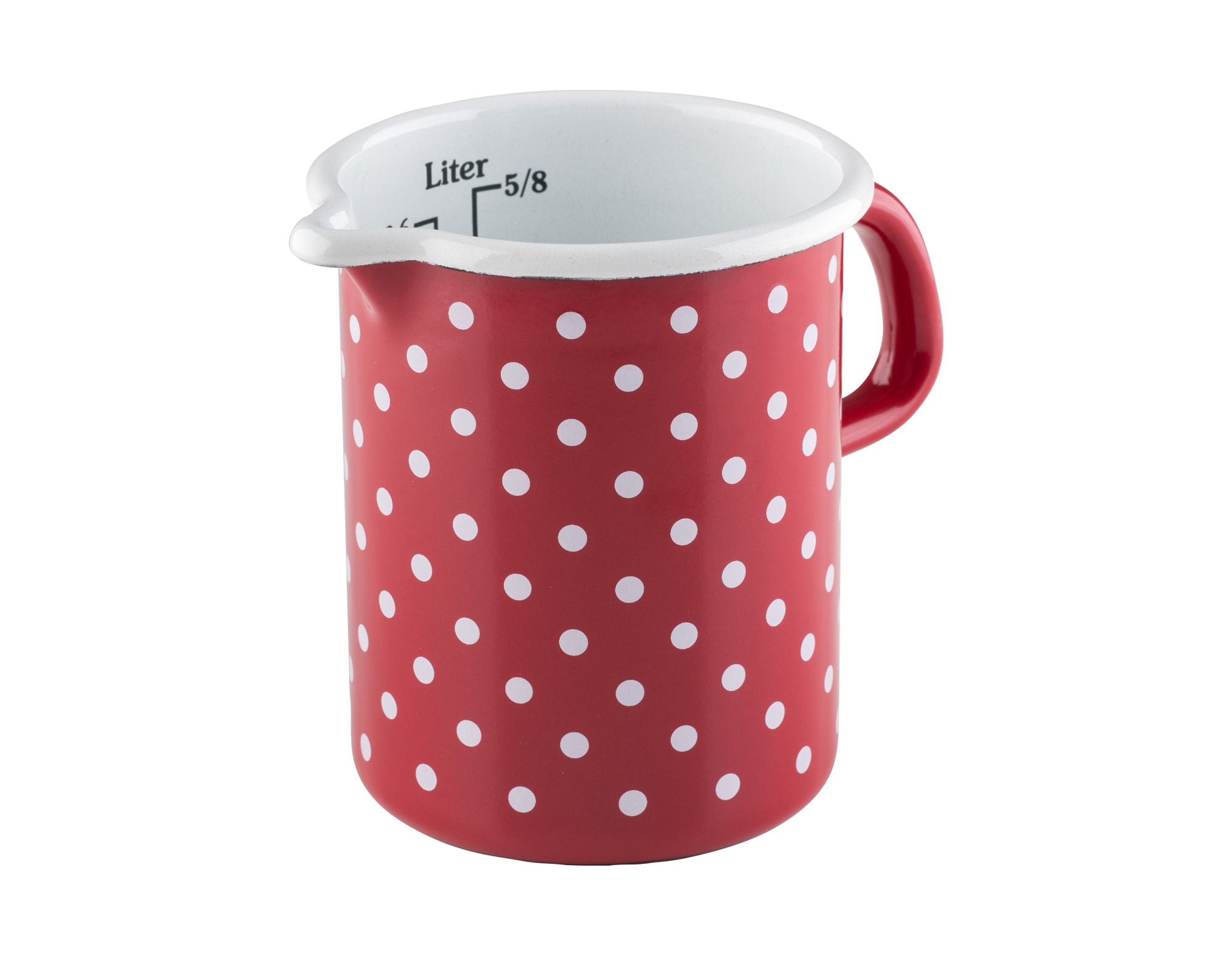 Das Küchenmaß oder der Messbecher ist ein unverzichtbares Werkzeug zum Portionieren von Koch- und Backzutaten wie Mehl, Zucker, Milch, Wasser sowie anderen kalten oder heißen Flüssigkeiten. Im Inneren des Messbechers befinden sich zwei Skalen, die einmal Liter in Zentilitern und je nach Größe des Messbechers auch in 1/4 oder 1/8 Liter anzeigen – dies entspricht der traditionellen österreichischen Maßeinheit für Flüssigkeiten. Der Messbecher ist mit einem bequemen seitlichen Griff und einem Ausguss, genannt Schnabel, ausgestattet, der das Ausgießen von Flüssigkeiten erleichtert. Der Emaille-Messbecher eignet sich auch hervorragend zum Erwärmen von genau abgemessenen Flüssigkeiten wie Milch oder Wasser für den Hefeteig oder Suppe für Risotto. Es sollte jedoch mit kleiner Flamme gekocht werden, da der Durchmesser des Bodens sehr klein ist. Beim Erwärmen von Milch empfiehlt es sich, etwas Wasser hinzuzufügen, um Anbrennen zu verhindern.