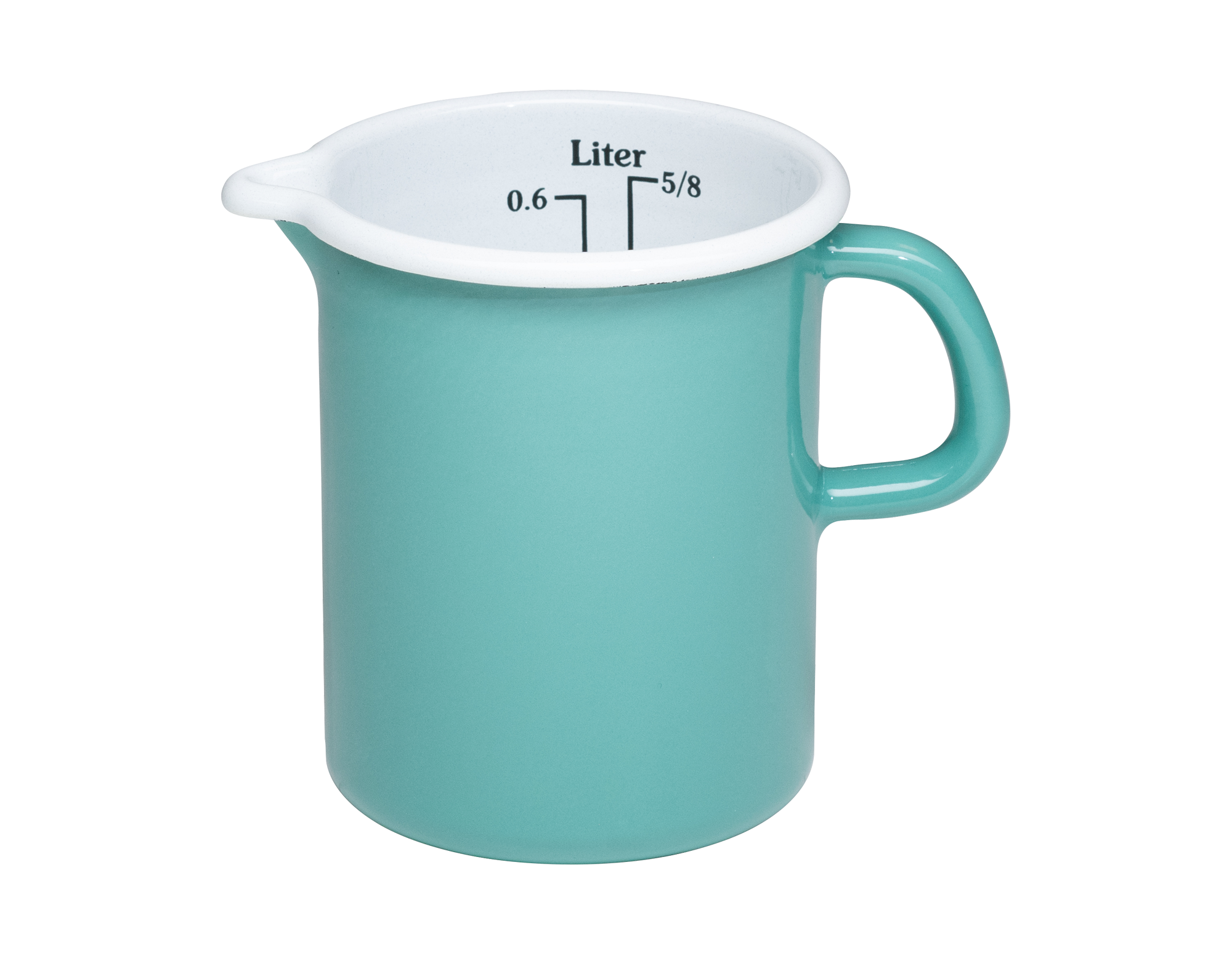 Das Küchenmaß oder der Messbecher ist ein unverzichtbares Werkzeug zum Portionieren von Koch- und Backzutaten wie Mehl, Zucker, Milch, Wasser sowie anderen kalten oder heißen Flüssigkeiten. Im Inneren des Messbechers befinden sich zwei Skalen, die einmal Liter in Zentilitern und je nach Größe des Messbechers auch in 1/4 oder 1/8 Liter anzeigen – dies entspricht der traditionellen österreichischen Maßeinheit für Flüssigkeiten. Der Messbecher ist mit einem bequemen seitlichen Griff und einem Ausguss, genannt Schnabel, ausgestattet, der das Ausgießen von Flüssigkeiten erleichtert. Der Emaille-Messbecher eignet sich auch hervorragend zum Erwärmen von genau abgemessenen Flüssigkeiten wie Milch oder Wasser für den Hefeteig oder Suppe für Risotto. Es sollte jedoch mit kleiner Flamme gekocht werden, da der Durchmesser des Bodens sehr klein ist. Beim Erwärmen von Milch empfiehlt es sich, etwas Wasser hinzuzufügen, um Anbrennen zu verhindern.