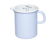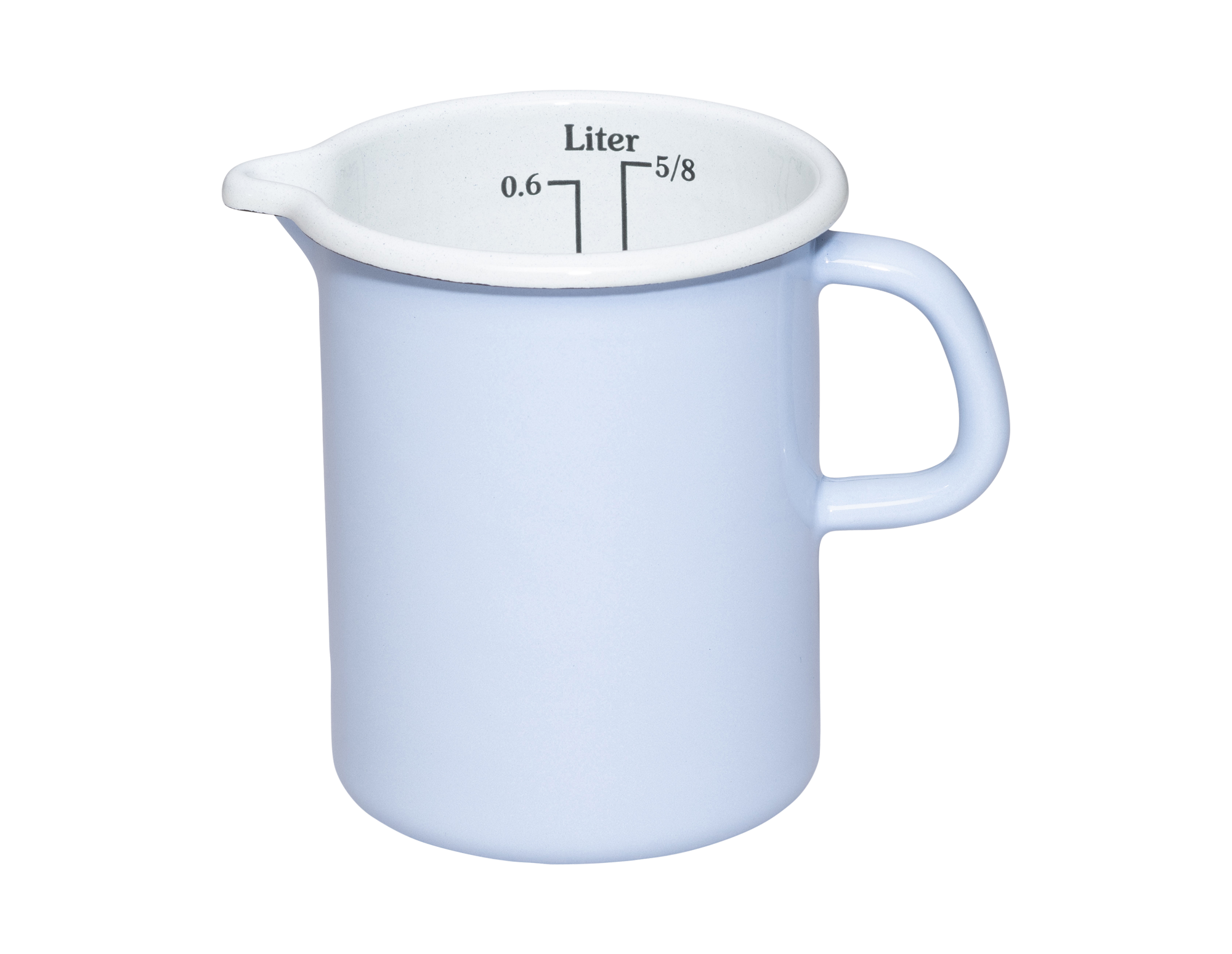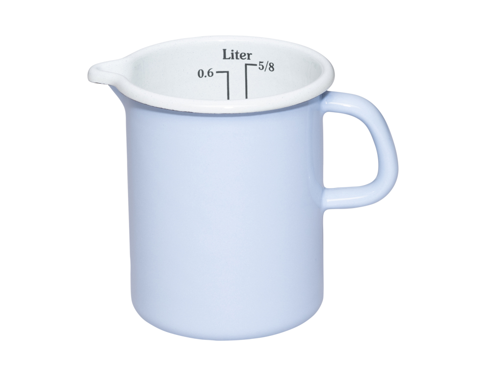 Das Küchenmaß oder der Messbecher ist ein unverzichtbares Werkzeug zum Portionieren von Koch- und Backzutaten wie Mehl, Zucker, Milch, Wasser sowie anderen kalten oder heißen Flüssigkeiten. Im Inneren des Messbechers befinden sich zwei Skalen, die einmal Liter in Zentilitern und je nach Größe des Messbechers auch in 1/4 oder 1/8 Liter anzeigen – dies entspricht der traditionellen österreichischen Maßeinheit für Flüssigkeiten. Der Messbecher ist mit einem bequemen seitlichen Griff und einem Ausguss, genannt Schnabel, ausgestattet, der das Ausgießen von Flüssigkeiten erleichtert. Der Emaille-Messbecher eignet sich auch hervorragend zum Erwärmen von genau abgemessenen Flüssigkeiten wie Milch oder Wasser für den Hefeteig oder Suppe für Risotto. Es sollte jedoch mit kleiner Flamme gekocht werden, da der Durchmesser des Bodens sehr klein ist. Beim Erwärmen von Milch empfiehlt es sich, etwas Wasser hinzuzufügen, um Anbrennen zu verhindern.