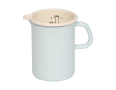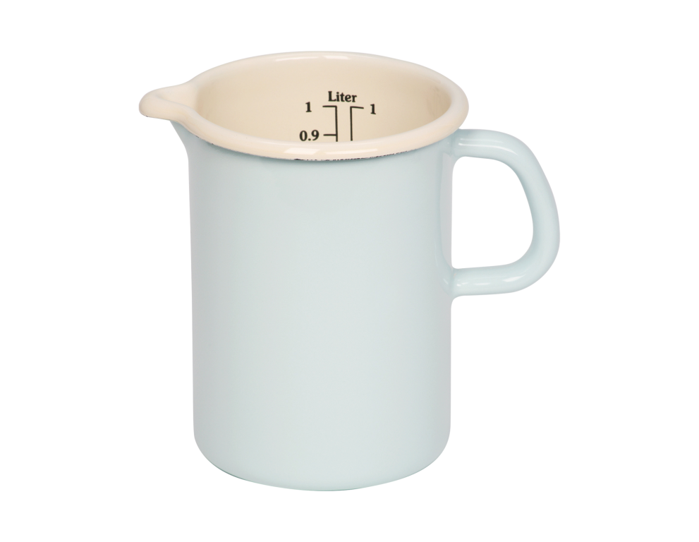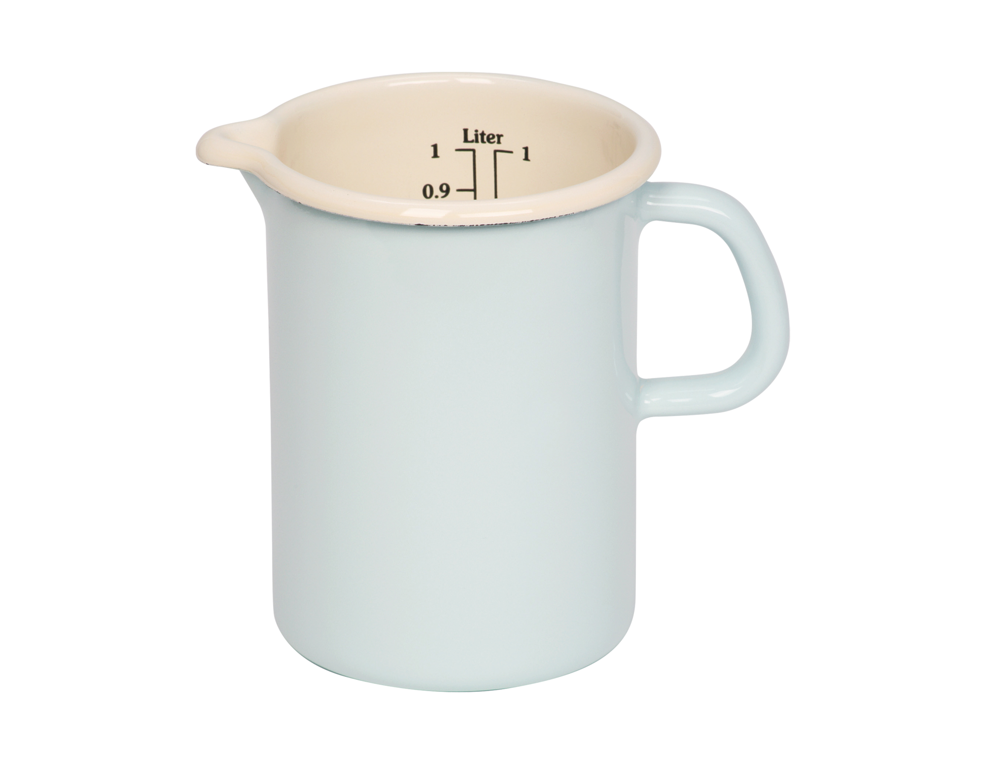 Das Küchenmaß oder der Messbecher ist ein unverzichtbares Werkzeug zum Portionieren von Koch- und Backzutaten wie Mehl, Zucker, Milch, Wasser sowie anderen kalten oder heißen Flüssigkeiten. Im Inneren des Messbechers befinden sich zwei Skalen, die einmal Liter in Zentilitern und je nach Größe des Messbechers auch in 1/4 oder 1/8 Liter anzeigen – dies entspricht der traditionellen österreichischen Maßeinheit für Flüssigkeiten. Der Messbecher ist mit einem bequemen seitlichen Griff und einem Ausguss, genannt Schnabel, ausgestattet, der das Ausgießen von Flüssigkeiten erleichtert. Der Emaille-Messbecher eignet sich auch hervorragend zum Erwärmen von genau abgemessenen Flüssigkeiten wie Milch oder Wasser für den Hefeteig oder Suppe für Risotto. Es sollte jedoch mit kleiner Flamme gekocht werden, da der Durchmesser des Bodens sehr klein ist. Beim Erwärmen von Milch empfiehlt es sich, etwas Wasser hinzuzufügen, um Anbrennen zu verhindern.