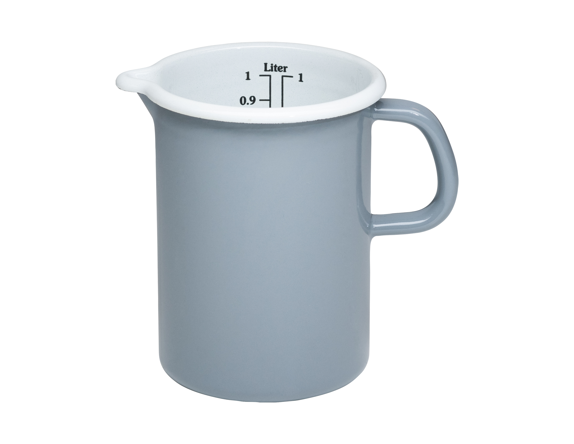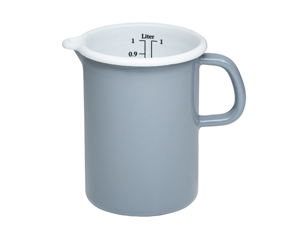 Das Küchenmaß oder der Messbecher ist ein unverzichtbares Werkzeug zum Portionieren von Koch- und Backzutaten wie Mehl, Zucker, Milch, Wasser sowie anderen kalten oder heißen Flüssigkeiten. Im Inneren des Messbechers befinden sich zwei Skalen, die einmal Liter in Zentilitern und je nach Größe des Messbechers auch in 1/4 oder 1/8 Liter anzeigen – dies entspricht der traditionellen österreichischen Maßeinheit für Flüssigkeiten. Der Messbecher ist mit einem bequemen seitlichen Griff und einem Ausguss, genannt Schnabel, ausgestattet, der das Ausgießen von Flüssigkeiten erleichtert. Der Emaille-Messbecher eignet sich auch hervorragend zum Erwärmen von genau abgemessenen Flüssigkeiten wie Milch oder Wasser für den Hefeteig oder Suppe für Risotto. Es sollte jedoch mit kleiner Flamme gekocht werden, da der Durchmesser des Bodens sehr klein ist. Beim Erwärmen von Milch empfiehlt es sich, etwas Wasser hinzuzufügen, um Anbrennen zu verhindern.