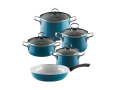 Unsere Geschirrset der Nouvelle Serie besticht durch modernes Design und einem spannenden Materialmix. Die Kasserollen und Kochtöpfe des Topfsets haben handlich geformte Edelstahlgriffe in modernem Design, die Pfanne einen ergonomischen Kunststoffgriff. Die Deckel der Kasserollen und Töpfe sind aus Glas und haben ebenfalls einen Edelstahlgriff. Der starke Stahl- Wärmespeicherboden sorgt dafür, dass sich die Wärme gleichmäßig und rasch verteilt. Dank der guten Wärmeleitung Emaille werden auch die Topfwände rundum warm, das spart Energie. Der robuste Chromrand verhindert das Abschlagen. Unser Kochgeschirr aus Emaille kann auf allen Herdarten (Gas, Elektro, Glaskeramik, Induktion und sogar über offenem Feuer) verwendet werden. Dank des Eisenkerns wird die Wärme schnell geleitet und dann gespeichert: für nachhaltiges, energiesparendes Kochen.