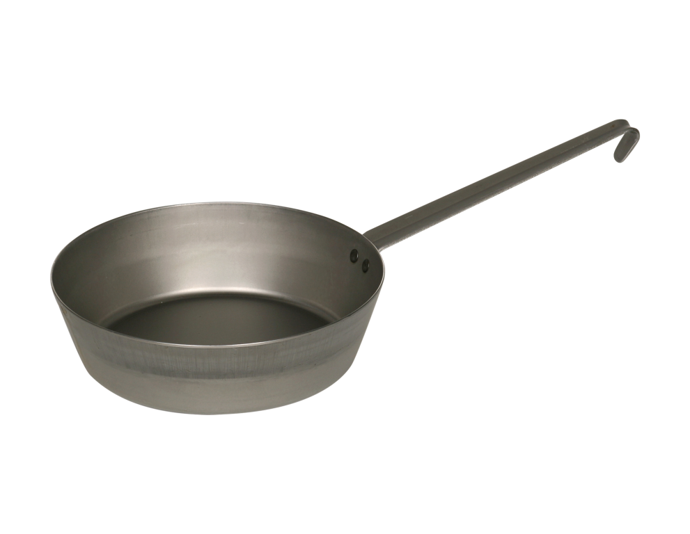 Unsere Eisenpfannen werden kaltgeschmiedet, indem eine ausgestanzte Stahlblechscheibe unter hohem Druck in eine Tiefziehform gepresst wird. An den Pfannenkörper wird ein Stiel befestigt, der immer eine Aufhängevorrichtung hat, damit die Pfanne wie früher üblich hängend aufbewahrt werden kann. Eisenpfannen sind bei Köchen nicht nur wegen ihres rustikalen Aussehens beliebt, sondern vor allem wegen ihrer exzellenten Brateigenschaften. Dank der schnellen Wärmeleitung von Eisen sind sie ideal zum scharfen Anbraten, was Bratkartoffeln und Fleisch besonders knusprig macht. Oft wird die Eisenpfanne auch als Servierpfanne verwendet, häufig in Verbindung mit dem „Pfannenknecht“ oder einem runden Brett als Pfannenuntersetzer. Mit der Zeit verbessert sich die Funktion der Pfanne durch die Bildung einer Patina, die durch die poröse Struktur der Pfanne entsteht und als Korrosionsschutz dient. Mit richtiger Pflege, um Rostbildung zu vermeiden, sind RIESS Eisenpfannen treue Begleiter für viele kulinarische Abenteuer. Neben der klassischen Verwendung für Bratkartoffeln, Fleisch oder Nockengerichte kann die Eisenpfanne für alle Gerichte genutzt werden, die eine Pfanne erfordern. Vor dem ersten Gebrauch muss die Wachsschicht, die als Rostschutz dient, mit heißem Wasser entfernt und die Pfanne eingebrannt werden. Nach Gebrauch sollte die Pfanne niemals in den Geschirrspüler gegeben werden. Stattdessen einfach mit einem Küchentuch auswischen. Bei starker Verkrustung mit Wasser, Salz und Bürste reinigen und dann auf der warmen Herdplatte gut trocknen lassen.