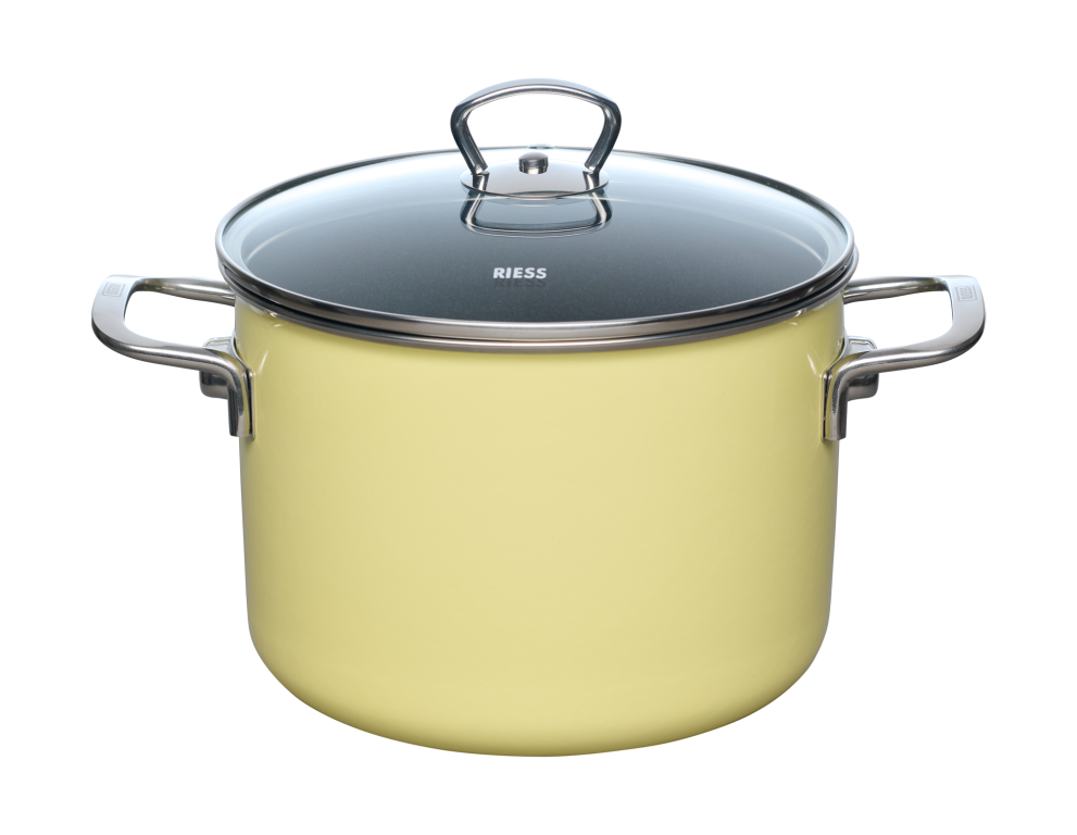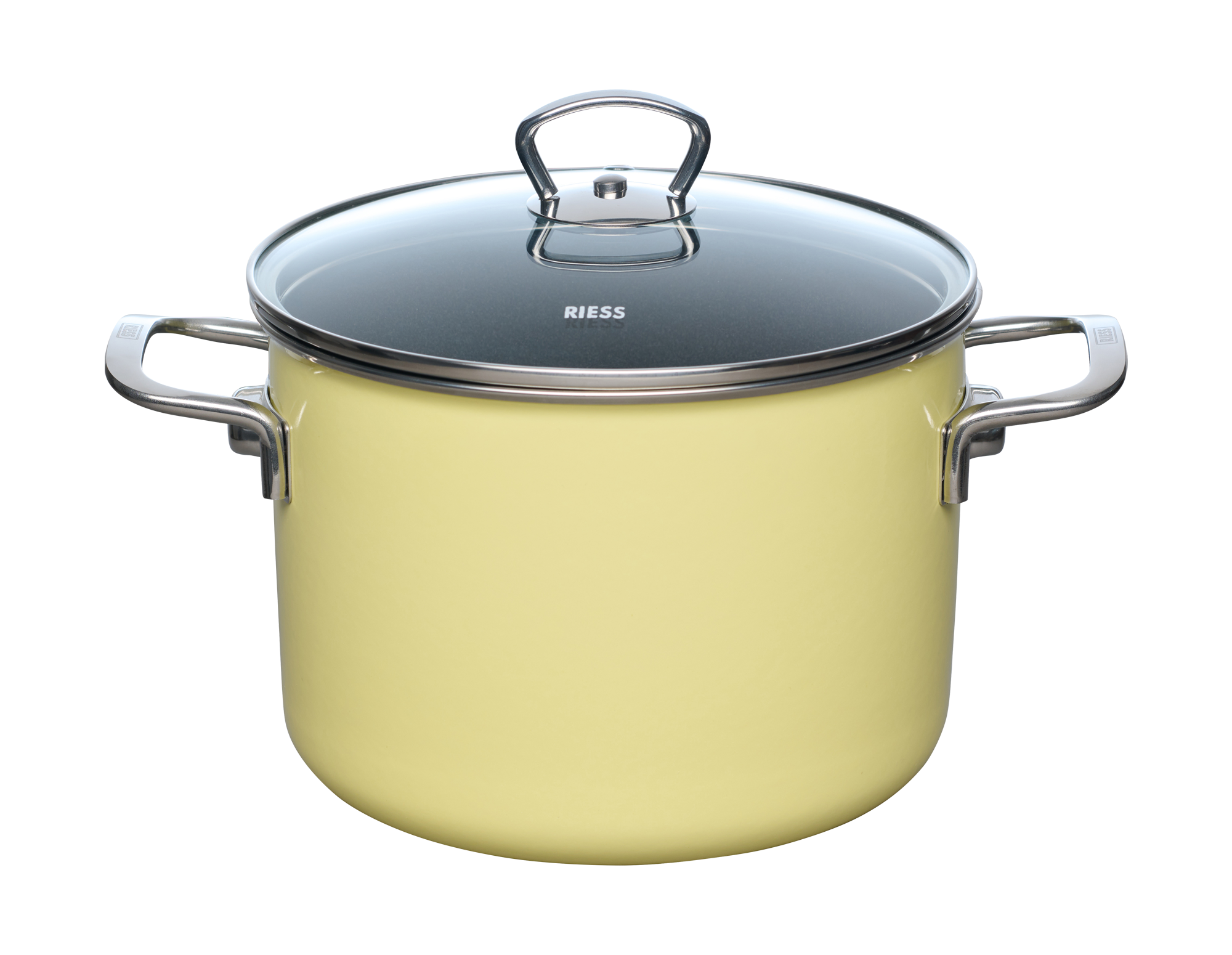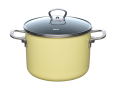 Der Limonen Farbton bringt den mediterranen Süden in die Küche und sorgt für gute Laune. Die Emailletöpfe und -kasserollen haben eine klassische zylindrische Form, rostfreien Schüttrand, Edelstahlgriffe und Glasdeckel. Der extra starke Stahl-Wärmespeicherboden gewährleistet besonders energieeffizientes Kochen.