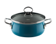 Edles Blau für all jene, denen gedeckte Farben und moderne Formen wichtig sind. Top-Qualität mit extra starkem Stahl-Wärmespeicherboden für besonders energieeffizientes Kochen, rostfreiem Schüttrand, Edelstahlgriffen und Glasdeckel.