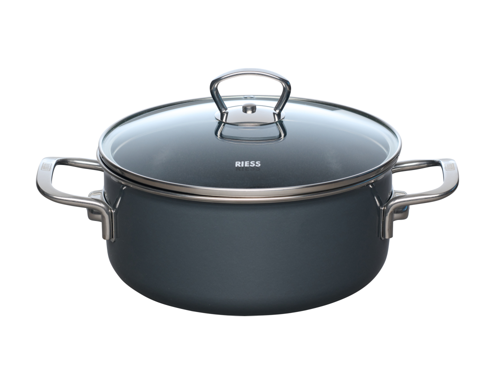 Der edle Grauton verleiht jeder Küche eine moderne, stilvolle Note und sieht am Tisch gut aus. Die Emailletöpfe und -kasserollen haben eine klassische zylindrische Form, rostfreien Schüttrand, Edelstahlgriffe und Glasdeckel. Der extra starke Stahl-Wärmespeicherboden gewährleistet besonders energieeffizientes Kochen.